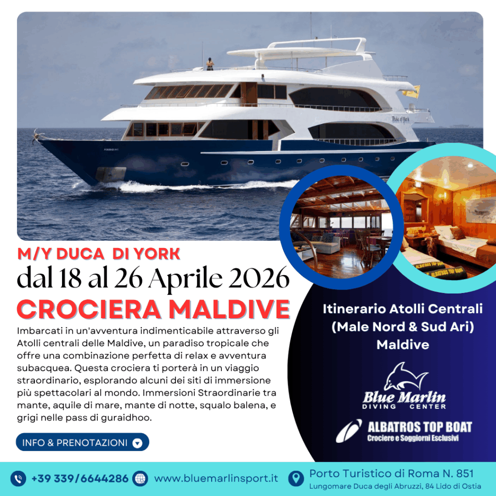 Maldive 2026 Per il 2026 torna la consueta crociera di immersioni alle Maldive!Per informazioniSabrina: 339.66.44.286